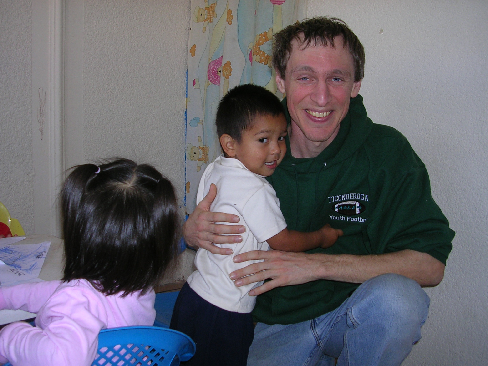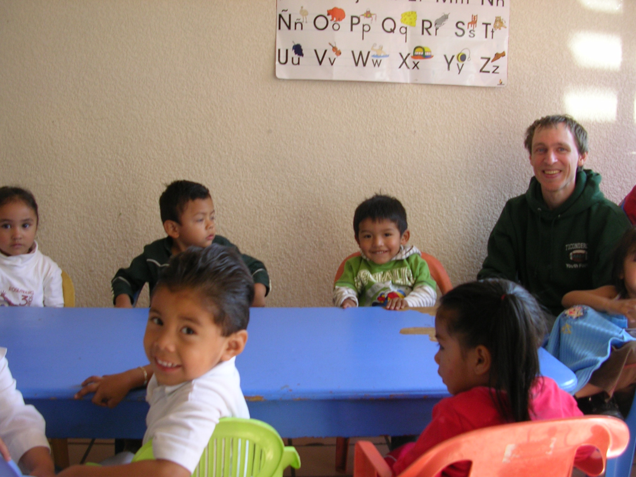 Nico's Day Care Center: Monday, February 16, we didn't have to get up so early, but I heard Nico and Dan talking before I got up. Nico had to go out, but the plan was that Nico would return sometime between 9 and 9:30 to get us. But he hadn't shown up by 10am. Finally Nico's wife, who had been so quiet I wasn't even sure she was there, came out and said something incomprehensible in Spanish. I asked her to repeat it, and I finally figured out that she would take us to where Nico works. We walked most of the way there, then we got to a busy street that was divided in the middle. As soon as we got there, we stopped to wait for traffic, but Nico's car was the first car to come along, and it stopped right in front of us! It wasn't much farther to where Nico works. He works at a day care center. He gave Dan and I a tour of the place and introduced us to two groups of children, and both groups sung a song for us. We got pictures as well.