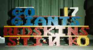 The first year that the Giants won the Superbowl was also the first year that I knew about that they even got into the playoffs. It had been a great season. For the NFC Championship game, the NY Giants played the Washington Redskins. as you can see, you can tell which team I wanted to win, and I wasn't disappointed. I don't know if this was the final score or not. If you look closely, you can see the multi-colored supports for the Giants sign.