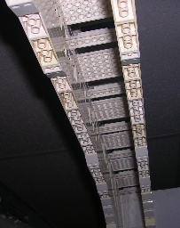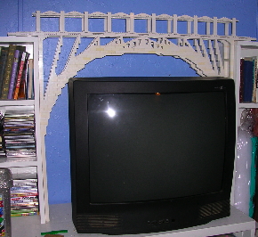 That's just one tower of the bridge, holding up the "suspension cables", and you can see them start up to the second tower to the far left of the picture. The "cables" turned out to be more of a liability than to provide actual support, but they looked nice. The bridge was strong enough to be held with one support under each tower while a train passed across. Those are HO gauge box cars in front of the bridge.