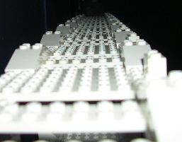 To build the bridge, I built the side supports first, then placed the arch on top of them. Then I placed the main deck on top of that. I had many trials building this bridge including the arch falling apart until I had built it strong enough to stay together while I put it into place, and discovering the gap was a tiny fraction narrower than a whole number of 1/1 bricks.